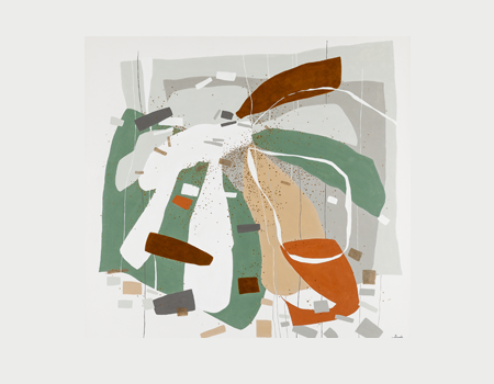 Desde 2023, sua pesquisa se volta para a natureza como fonte de inspiração. Folhas, flores e elementos orgânicos dialogam com estruturas geométricas, revelando uma estética mais leve e expansiva. Suas telas em acrílica e colagens mistas se integram a ambientes modernos e minimalistas, irradiando acolhimento e o desejo de permanência.