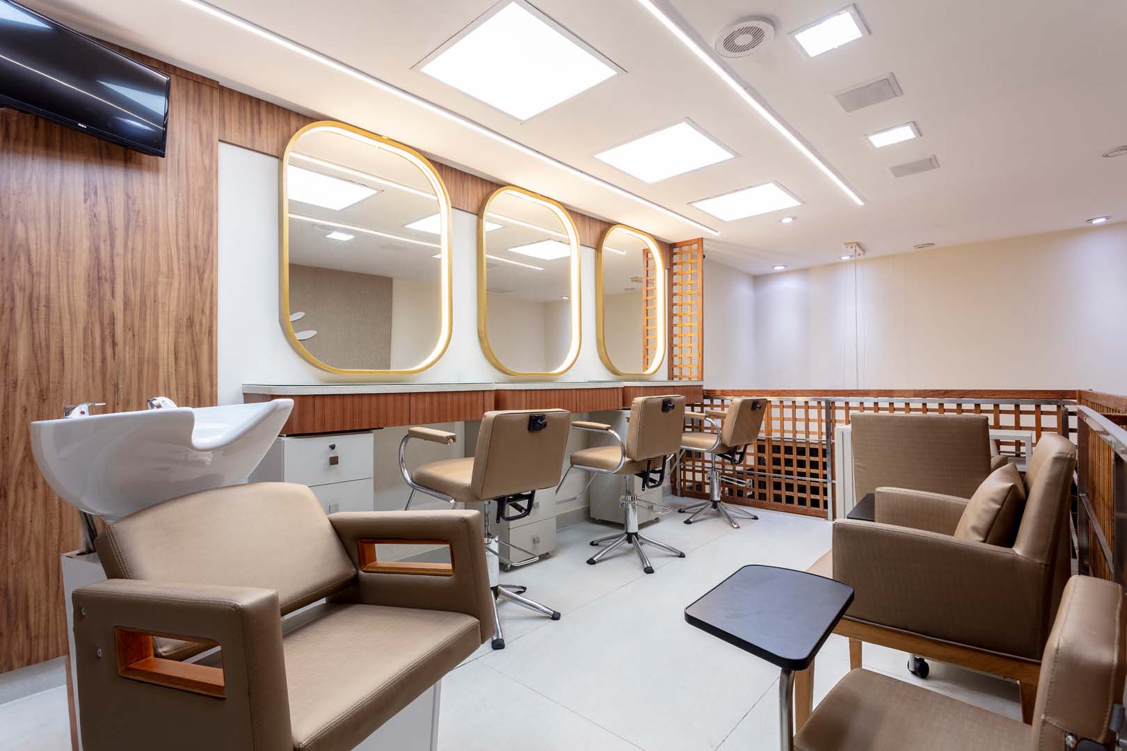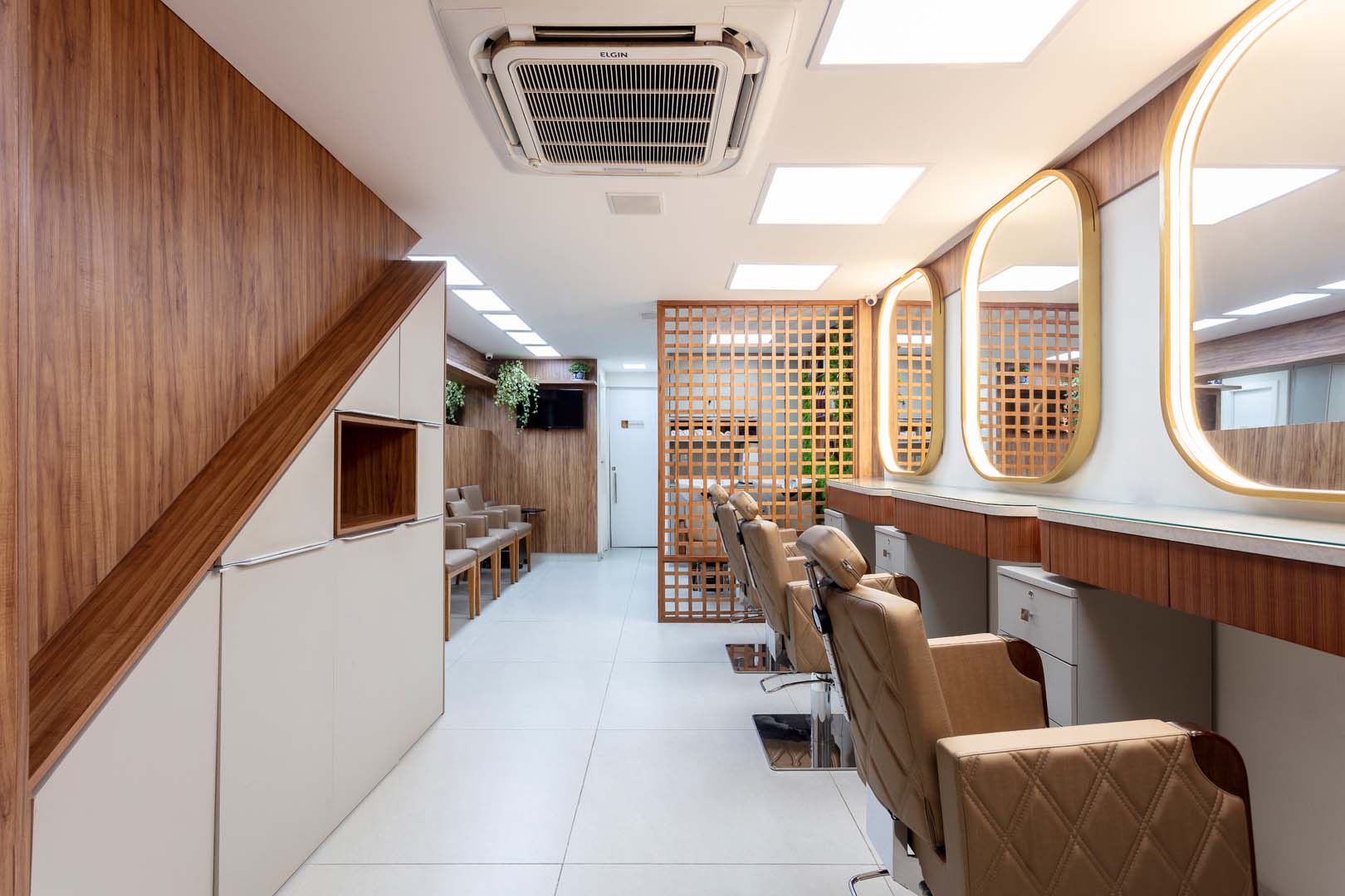 O layout privilegia a fluidez e a funcionalidade, organizando os ambientes de forma clara e intuitiva, sem abrir mão da privacidade necessária aos procedimentos estéticos. A iluminação, distribuída de maneira estratégica, contribui para realçar volumes, valorizar acabamentos e proporcionar uma sensação constante de bem-estar — elemento essencial em espaços dedicados à beleza e à autoestima.
