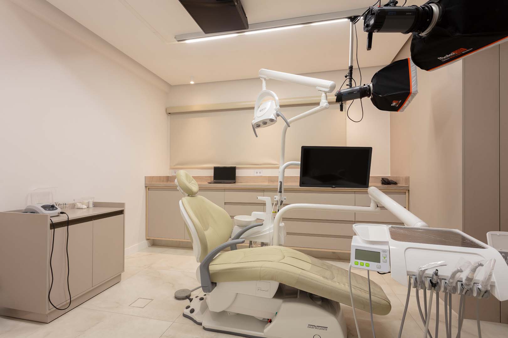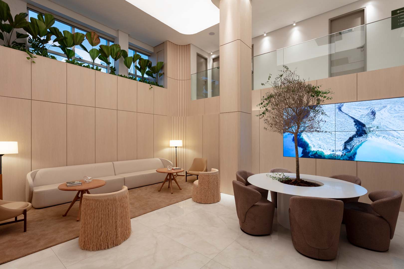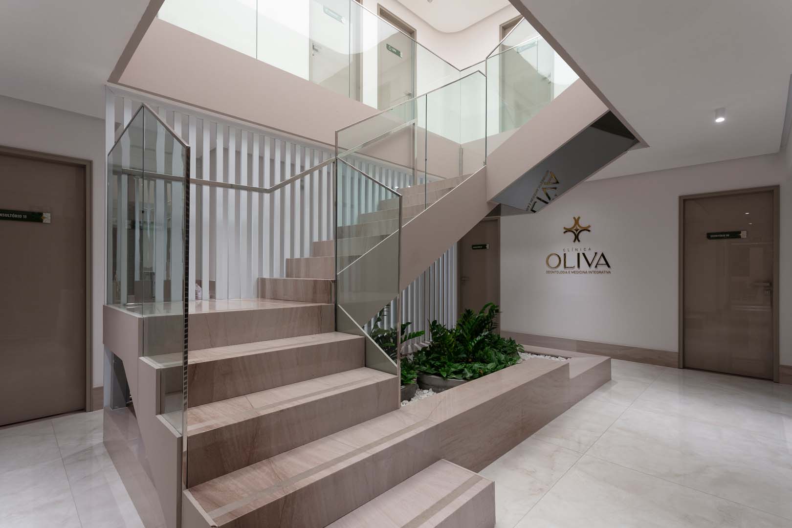 O pé-direito duplo estrutura o layout em dois níveis, conectados por um mezanino aberto que garante leitura espacial clara e integração visual entre os ambientes. O verde orienta o conceito do projeto: jardins internos reforçam a biofilia e promovem bem-estar, enquanto a oliveira que emerge de uma mesa redonda, na recepção, assume um gesto simbólico em referência ao nome da clínica. Sob a escada, no mezanino e nas áreas de espera, a presença da natureza estabelece um diálogo equilibrado com a tecnologia, a precisão clínica e a escolha criteriosa de materiais.